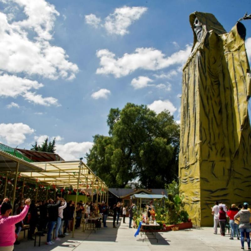 Their arms raised towards the sky, worshippers of Mexico's "saint" of death pray before a giant cloaked skeleton asking for...