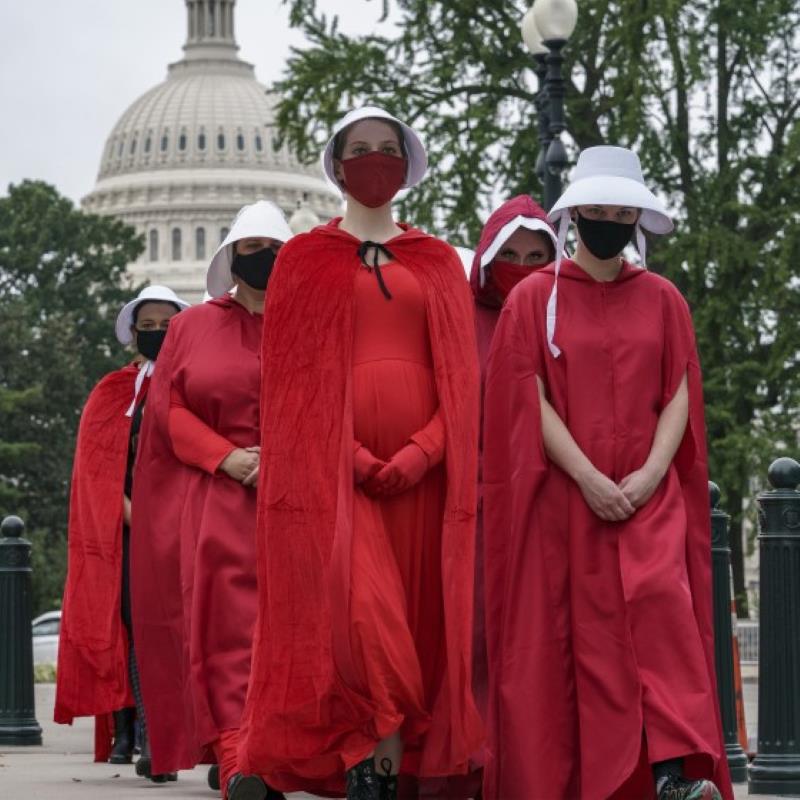 Activists costumed as handmaids from "The Handmaid's Tale" marched in protest of the Senate confirmation of Supreme Court nominee Amy...