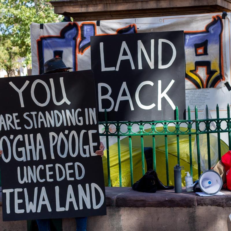 Two people chained themselves to an obelisk in Santa Fe Plaza to demand the immediate removal of a monument to...